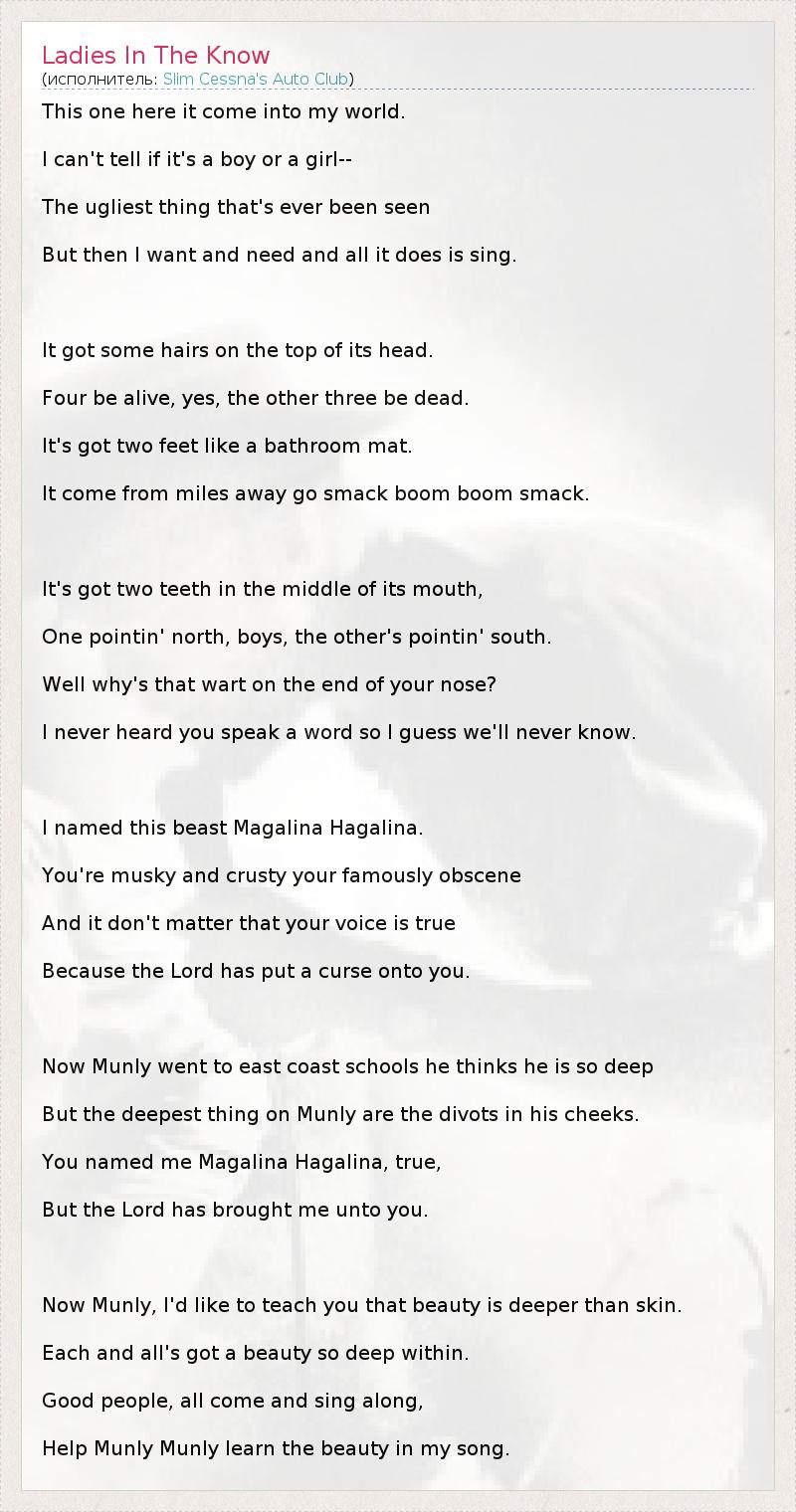 This one here it come into my world. I can't tell if it's a boy or a girl-- The ugliest thing that's ever been seen But then I want and need and all it does is sing. It got some hairs on the top of its head. Four be alive, yes, the other three be dead. It's got two feet like a bathroom mat. It come from miles away go smack boom boom smack. It's got two teeth in the middle of its mouth, One pointin' north, boys, the other's pointin' south. Well why's that wart on the end of your nose? I never heard you speak a word so I guess we'll never know. I named this beast Magalina Hagalina. You're musky and crusty your famously obscene And it don't matter that your voice is true Because the Lord has put a curse onto you. Now Munly went to east coast schools he thinks he is so deep But the deepest thing on Munly are the divots in his cheeks. You named me Magalina Hagalina, true, But the Lord has brought me unto you. Now Munly, I'd like to teach you that beauty is deeper than skin. Each and all's got a beauty so deep within. Good people, all come and sing along, Help Munly Munly learn the beauty in my song.