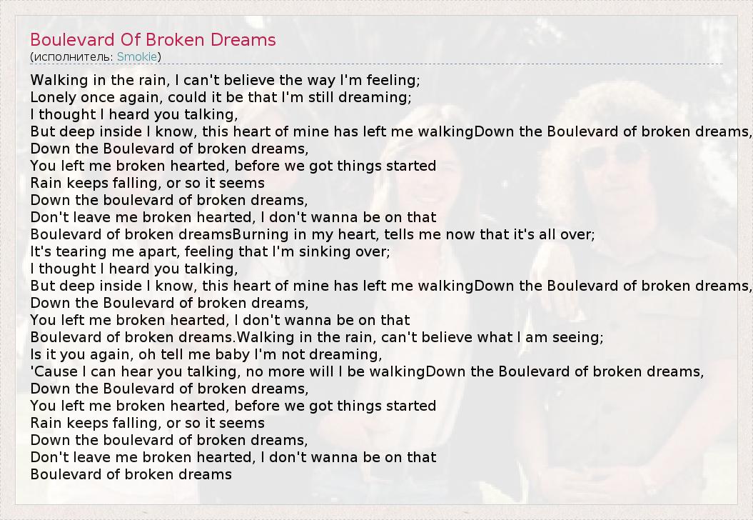 'Cause I can hear you talking, no more will I be walkingDown the Boulevard of broken dreams,