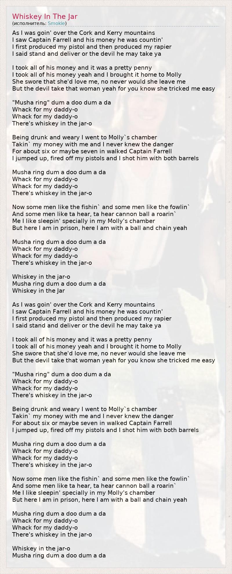 As I was goin' over the Cork and Kerry mountains I saw Captain Farrell and his money he was countin' I first produced my pistol and then produced my rapier I said stand and deliver or the devil he may take ya I took all of his money and it was a pretty penny I took all of his money yeah and I brought it home to Molly She swore that she'd love me, no never would she leave me But the devil take that woman yeah for you know she tricked me easy "Musha ring" dum a doo dum a da Whack for my daddy-o Whack for my daddy-o There's whiskey in the jar-o Being drunk and weary I went to Molly`s chamber Takin` my money with me and I never knew the danger For about six or maybe seven in walked Captain Farrell I jumped up, fired off my pistols and I shot him with both barrels Musha ring dum a doo dum a da Whack for my daddy-o Whack for my daddy-o There's whiskey in the jar-o Now some men like the fishin` and some men like the fowlin` And some men like ta hear, ta hear cannon ball a roarin` Me I like sleepin' specially in my Molly's chamber But here I am in prison, here I am with a ball and chain yeah Musha ring dum a doo dum a da Whack for my daddy-o Whack for my daddy-o There's whiskey in the jar-o Whiskey in the jar-o Musha ring dum a doo dum a da Whiskey in the Jar As I was goin' over the Cork and Kerry mountains I saw Captain Farrell and his money he was countin' I first produced my pistol and then produced my rapier I said stand and deliver or the devil he may take ya I took all of his money and it was a pretty penny I took all of his money yeah and I brought it home to Molly She swore that she'd love me, no never would she leave me But the devil take that woman yeah for you know she tricked me easy "Musha ring" dum a doo dum a da Whack for my daddy-o Whack for my daddy-o There's whiskey in the jar-o Being drunk and weary I went to Molly`s chamber Takin` my money with me and I never knew the danger For about six or maybe seven in walked Captain Farrell I jumped up, fired off my pistols and I shot him with both barrels Musha ring dum a doo dum a da Whack for my daddy-o Whack for my daddy-o There's whiskey in the jar-o Now some men like the fishin` and some men like the fowlin` And some men like ta hear, ta hear cannon ball a roarin` Me I like sleepin' specially in my Molly's chamber But here I am in prison, here I am with a ball and chain yeah Musha ring dum a doo dum a da Whack for my daddy-o Whack for my daddy-o There's whiskey in the jar-o Whiskey in the jar-o Musha ring dum a doo dum a da