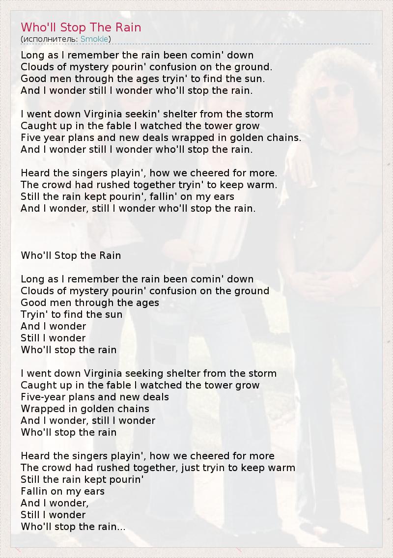 Насколько я помню, тогда шел дождь, И облака, полные загадочности, проливались на землю смятением. Хорошие люди годами пытаются найти солнце, И мне интересно, до сих пор интересно, кто же остановит дождь? Я шёл по Вирджинии, ища убежище от грозы, Увлечённый легендой, я наблюдал, как растёт башня. Планы пятилетки и новые сделки опутаны золотыми цепями, А мне интересно, до сих пор интересно, кто же остановит дождь? Слышал, как играют музыканты, как мы приветствовали их, вызывая на бис. В толпе все прижались друг к другу, стараясь сохранить тепло, А дождь всё лился, стекая по моим ушам. И мне интересно, до сих пор интересно, кто же остановит дождь? Кто остановит дождь? (перевод Работнов Сергей из Ярославля) Снова дождь-зануда как из бочки льёт. Стая туч густая по земле ползёт. Дни, недели, годы.. Снова солнца ждёшь. Кто же первый Скажет смело: Стоп! Стихни дождь! Я искал повсюду от дождя приют. Солнечного замка нет ни там, ни тут. Дождь смывает планы. Время не вернёшь. Кто же первый скажет смело: Стоп! Стихни дождь! Вдруг в дали дождливой песни услыхал. Там народ счастливый под дождём плясал. Если жить уныло Счастья не найдёшь. Будь же первым! Крикни смело: Стоп! Стихни дождь!