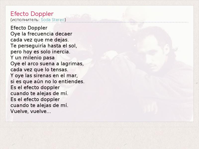 Efecto Doppler Oye la frecuencia decaer cada vez que me dejas. Te perseguiría hasta el sol, pero hoy es solo inercia. Y un milenio pasa Oye el arco suena a lagrimas, cada vez que lo tensas. Y oye las sirenas en el mar, si es que aún no lo entiendes. Es el efecto doppler cuando te alejas de mí. Es el efecto doppler cuando te alejas de mí. Vuelve, vuelve...