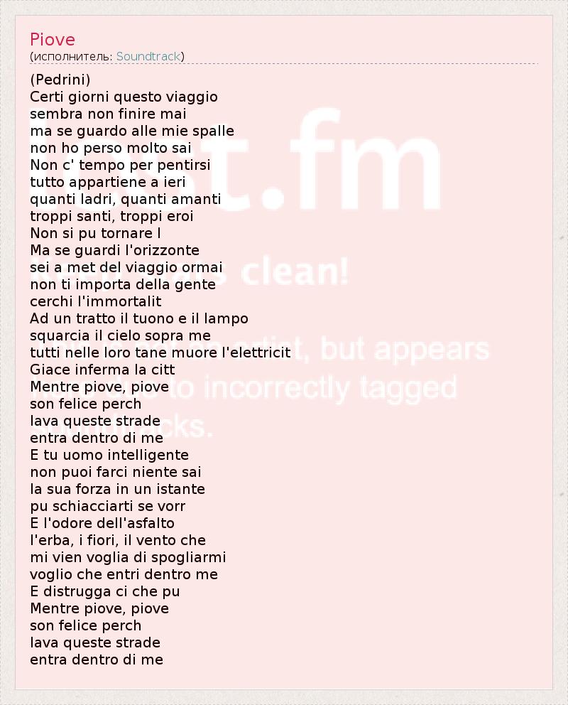 (Pedrini) Certi giorni questo viaggio sembra non finire mai ma se guardo alle mie spalle non ho perso molto sai Non c' tempo per pentirsi tutto appartiene a ieri quanti ladri, quanti amanti troppi santi, troppi eroi Non si pu tornare l Ma se guardi l'orizzonte sei a met del viaggio ormai non ti importa della gente cerchi l'immortalit Ad un tratto il tuono e il lampo squarcia il cielo sopra me tutti nelle loro tane muore l'elettricit Giace inferma la citt Mentre piove, piove son felice perch lava queste strade entra dentro di me E tu uomo intelligente non puoi farci niente sai la sua forza in un istante pu schiacciarti se vorr E l'odore dell'asfalto l'erba, i fiori, il vento che mi vien voglia di spogliarmi voglio che entri dentro me E distrugga ci che pu Mentre piove, piove son felice perch lava queste strade entra dentro di me