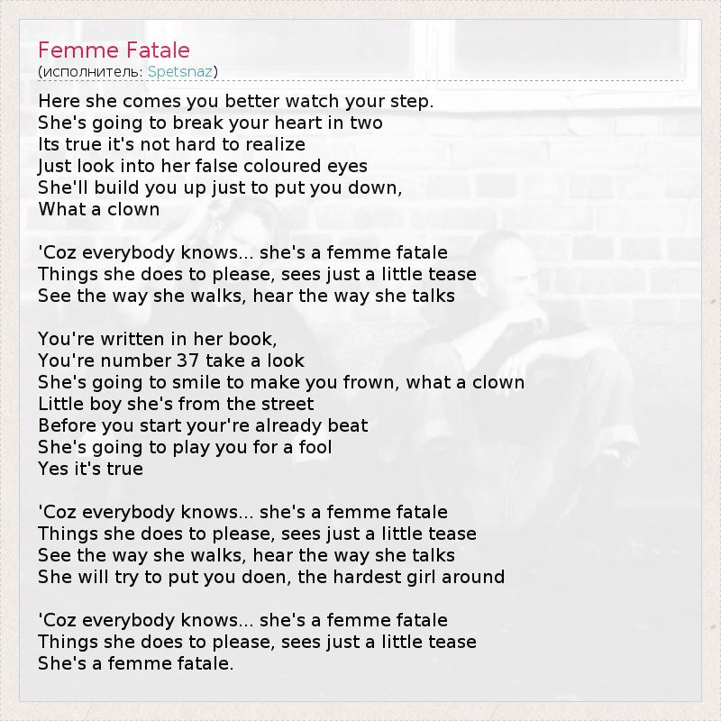 Here she comes you better watch your step. She's going to break your heart in two Its true it's not hard to realize Just look into her false coloured eyes She'll build you up just to put you down, What a clown 'Coz everybody knows... she's a femme fatale Things she does to please, sees just a little tease See the way she walks, hear the way she talks You're written in her book, You're number 37 take a look She's going to smile to make you frown, what a clown Little boy she's from the street Before you start your're already beat She's going to play you for a fool Yes it's true 'Coz everybody knows... she's a femme fatale Things she does to please, sees just a little tease See the way she walks, hear the way she talks She will try to put you doen, the hardest girl around 'Coz everybody knows... she's a femme fatale Things she does to please, sees just a little tease She's a femme fatale.