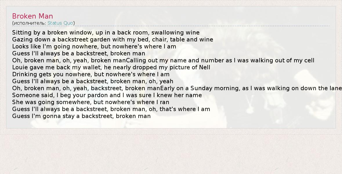 Oh, broken man, oh, yeah, backstreet, broken manEarly on a Sunday morning, as I was walking on down the lane