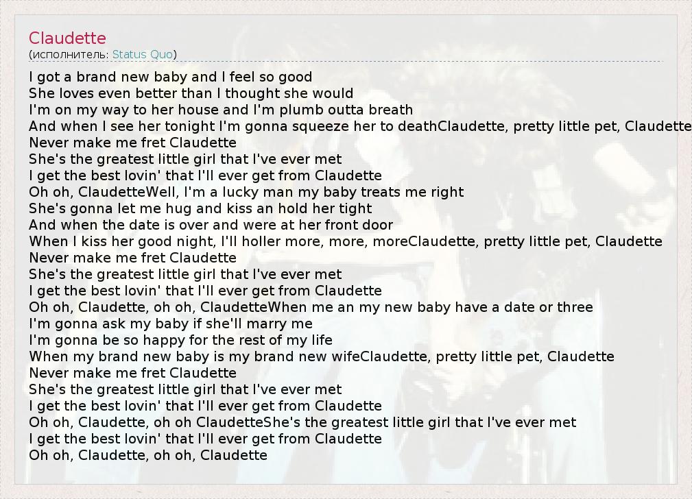 And when I see her tonight I'm gonna squeeze her to deathClaudette, pretty little pet, Claudette