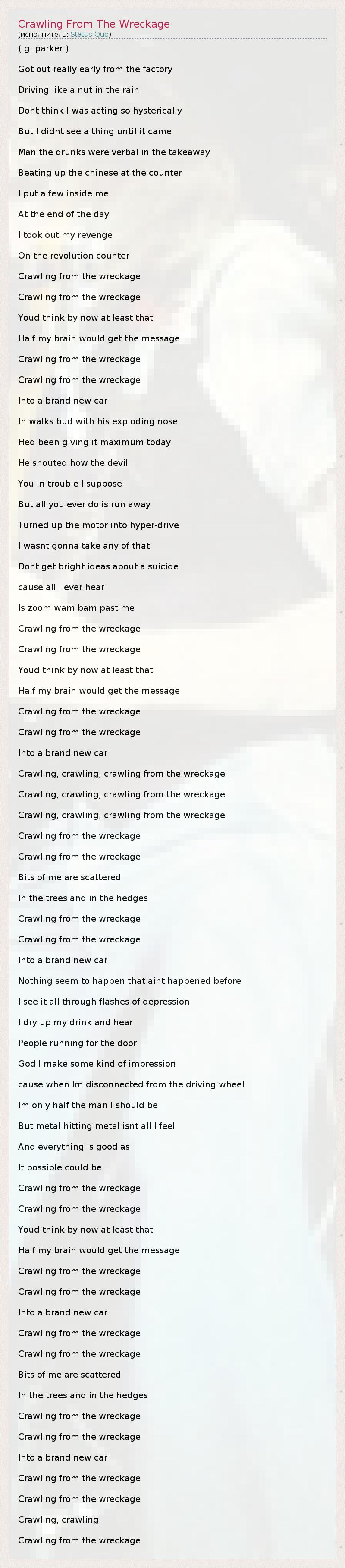 ( g. parker ) Got out really early from the factory Driving like a nut in the rain Dont think I was acting so hysterically But I didnt see a thing until it came Man the drunks were verbal in the takeaway Beating up the chinese at the counter I put a few inside me At the end of the day I took out my revenge On the revolution counter Crawling from the wreckage Crawling from the wreckage Youd think by now at least that Half my brain would get the message Crawling from the wreckage Crawling from the wreckage Into a brand new car In walks bud with his exploding nose Hed been giving it maximum today He shouted how the devil You in trouble I suppose But all you ever do is run away Turned up the motor into hyper-drive I wasnt gonna take any of that Dont get bright ideas about a suicide cause all I ever hear Is zoom wam bam past me Crawling from the wreckage Crawling from the wreckage Youd think by now at least that Half my brain would get the message Crawling from the wreckage Crawling from the wreckage Into a brand new car Crawling, crawling, crawling from the wreckage Crawling, crawling, crawling from the wreckage Crawling, crawling, crawling from the wreckage Crawling from the wreckage Crawling from the wreckage Bits of me are scattered In the trees and in the hedges Crawling from the wreckage Crawling from the wreckage Into a brand new car Nothing seem to happen that aint happened before I see it all through flashes of depression I dry up my drink and hear People running for the door God I make some kind of impression cause when Im disconnected from the driving wheel Im only half the man I should be But metal hitting metal isnt all I feel And everything is good as It possible could be Crawling from the wreckage Crawling from the wreckage Youd think by now at least that Half my brain would get the message Crawling from the wreckage Crawling from the wreckage Into a brand new car Crawling from the wreckage Crawling from the wreckage Bits of me are scattered In the trees and in the hedges Crawling from the wreckage Crawling from the wreckage Into a brand new car Crawling from the wreckage Crawling from the wreckage Crawling, crawling Crawling from the wreckage