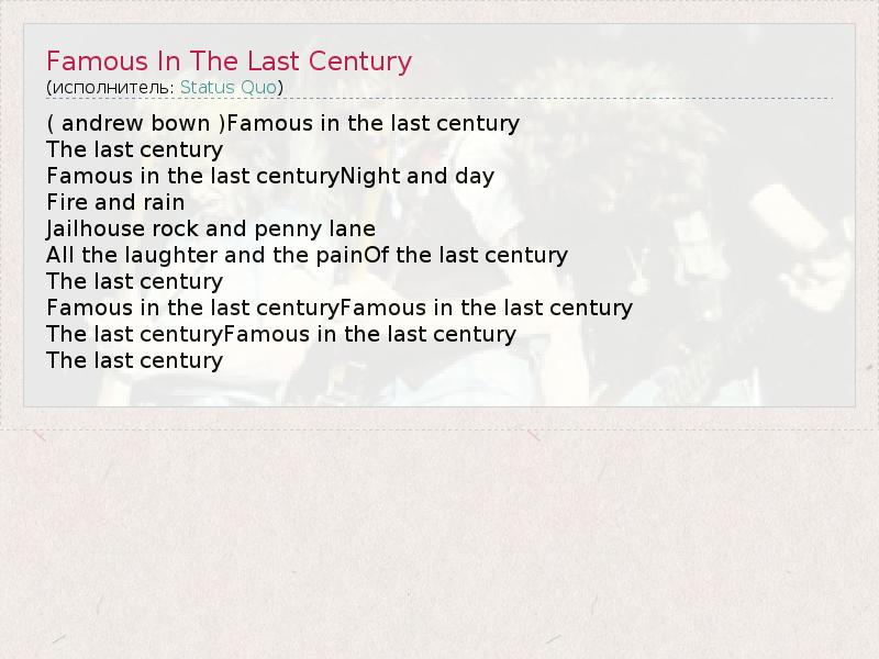 ( andrew bown )Famous in the last century The last century Famous in the last centuryNight and day Fire and rain Jailhouse rock and penny lane All the laughter and the painOf the last century The last century Famous in the last centuryFamous in the last century The last centuryFamous in the last century The last century