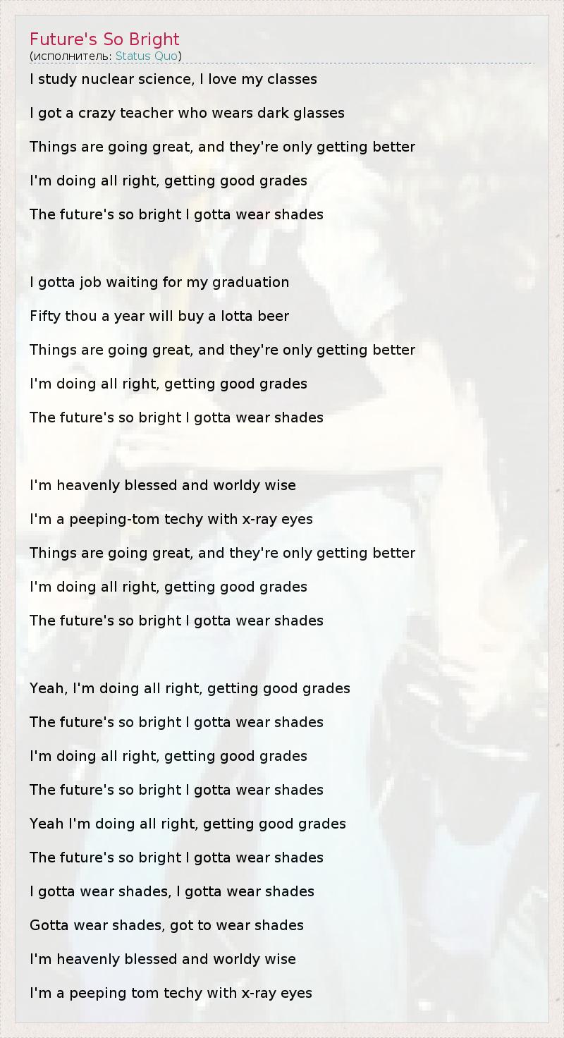 I study nuclear science, I love my classes I got a crazy teacher who wears dark glasses Things are going great, and they're only getting better I'm doing all right, getting good grades The future's so bright I gotta wear shades I gotta job waiting for my graduation Fifty thou a year will buy a lotta beer Things are going great, and they're only getting better I'm doing all right, getting good grades The future's so bright I gotta wear shades I'm heavenly blessed and worldy wise I'm a peeping-tom techy with x-ray eyes Things are going great, and they're only getting better I'm doing all right, getting good grades The future's so bright I gotta wear shades Yeah, I'm doing all right, getting good grades The future's so bright I gotta wear shades I'm doing all right, getting good grades The future's so bright I gotta wear shades Yeah I'm doing all right, getting good grades The future's so bright I gotta wear shades I gotta wear shades, I gotta wear shades Gotta wear shades, got to wear shades I'm heavenly blessed and worldy wise I'm a peeping tom techy with x-ray eyes