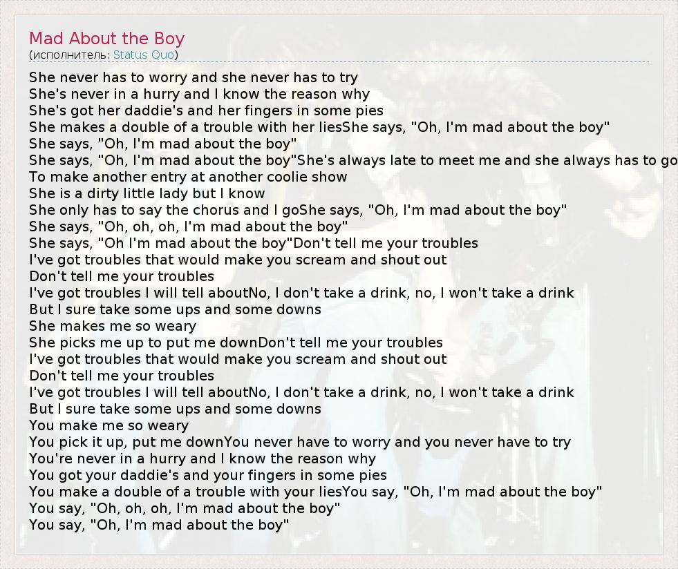 А как ты думаешь, о чем песня "Mad About the Boy" ?