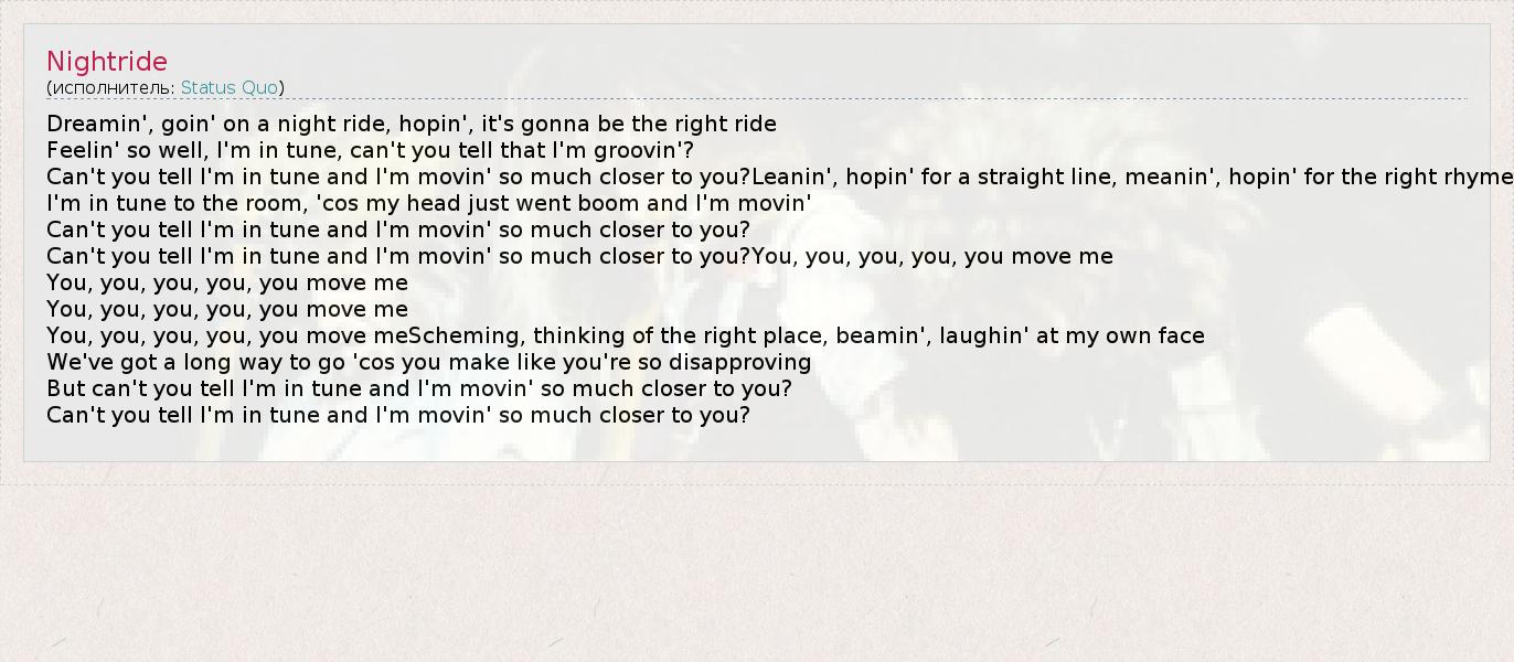 Это интересно:Status Quo — популярная и коммерчески успешная английская рок-группа. Основана бас-гитаристом Аланом Ланкастером и лидер-гитаристом Фрэнсисом Росси в 1962 году в Лондоне. Их музыка базируется на стыке рок-н-ролла, ритм-энд-блюза и буги-вуги в сочетании с имиджем простых парней, незатейливыми песнями и прекрасными мелодиями. Это и обеспечило Status quo успех во всём мире. Их самый известный хит «In... продолжение