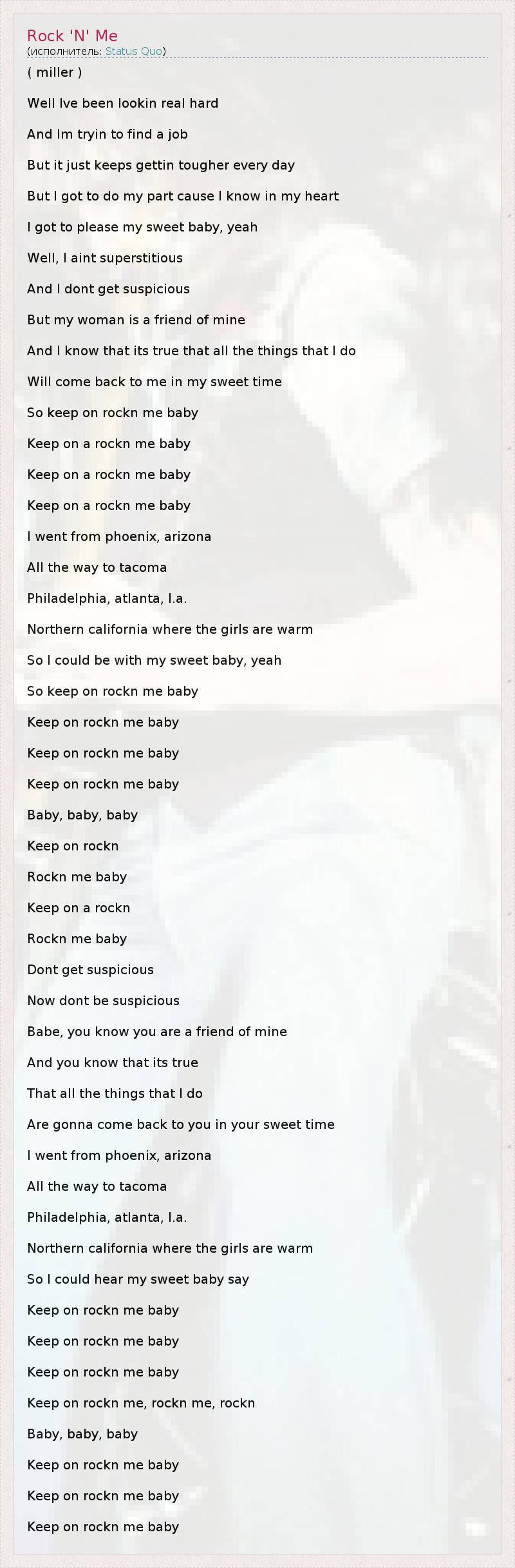 ( miller ) Well Ive been lookin real hard And Im tryin to find a job But it just keeps gettin tougher every day But I got to do my part cause I know in my heart I got to please my sweet baby, yeah Well, I aint superstitious And I dont get suspicious But my woman is a friend of mine And I know that its true that all the things that I do Will come back to me in my sweet time So keep on rockn me baby Keep on a rockn me baby Keep on a rockn me baby Keep on a rockn me baby I went from phoenix, arizona All the way to tacoma Philadelphia, atlanta, l.a. Northern california where the girls are warm So I could be with my sweet baby, yeah So keep on rockn me baby Keep on rockn me baby Keep on rockn me baby Keep on rockn me baby Baby, baby, baby Keep on rockn Rockn me baby Keep on a rockn Rockn me baby Dont get suspicious Now dont be suspicious Babe, you know you are a friend of mine And you know that its true That all the things that I do Are gonna come back to you in your sweet time I went from phoenix, arizona All the way to tacoma Philadelphia, atlanta, l.a. Northern california where the girls are warm So I could hear my sweet baby say Keep on rockn me baby Keep on rockn me baby Keep on rockn me baby Keep on rockn me, rockn me, rockn Baby, baby, baby Keep on rockn me baby Keep on rockn me baby Keep on rockn me baby