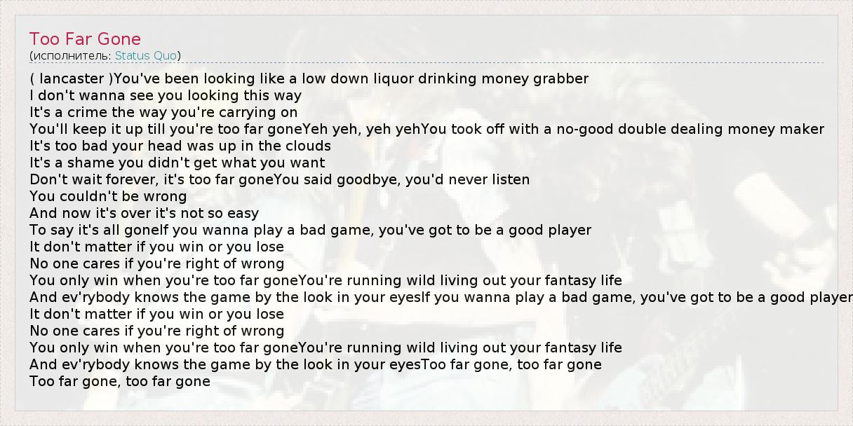 А как ты думаешь, о чем песня "Too Far Gone" ?