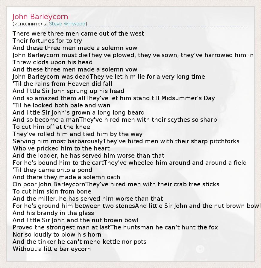 There were three men came out of the west Their fortunes for to try And these three men made a solemn vow John Barleycorn must dieThey've plowed, they've sown, they've harrowed him in Threw clods upon his head And these three men made a solemn vow John Barleycorn was deadThey've let him lie for a very long time 'Til the rains from Heaven did fall And little Sir John sprung up his head And so amazed them allThey've let him stand till Midsummer's Day 'Til he looked both pale and wan And little Sir John's grown a long long beard And so become a manThey've hired men with their scythes so sharp To cut him off at the knee They've rolled him and tied him by the way Serving him most barbarouslyThey've hired men with their sharp pitchforks Who've pricked him to the heart And the loader, he has served him worse than that For he's bound him to the cartThey've wheeled him around and around a field 'Til they came onto a pond And there they made a solemn oath On poor John BarleycornThey've hired men with their crab tree sticks To cut him skin from bone And the miller, he has served him worse than that For he's ground him between two stonesAnd little Sir John and the nut brown bowl And his brandy in the glass And little Sir John and the nut brown bowl Proved the strongest man at lastThe huntsman he can't hunt the fox Nor so loudly to blow his horn And the tinker he can't mend kettle nor pots Without a little barleycorn