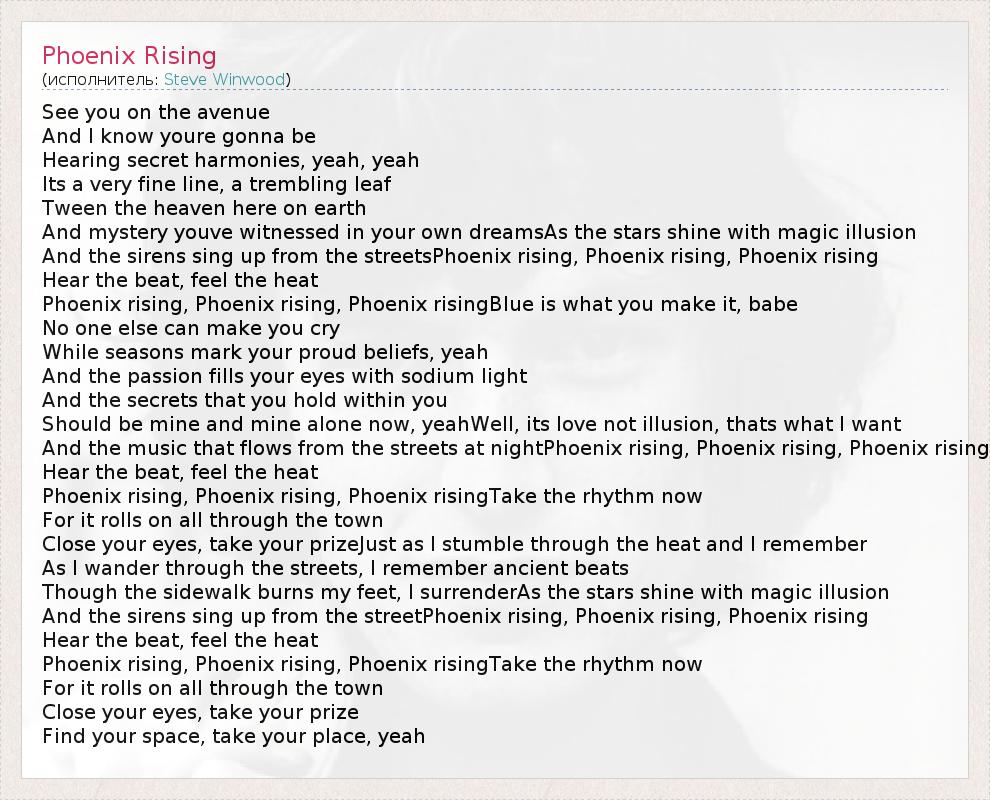 See you on the avenue And I know youre gonna be Hearing secret harmonies, yeah, yeah Its a very fine line, a trembling leaf Tween the heaven here on earth And mystery youve witnessed in your own dreamsAs the stars shine with magic illusion And the sirens sing up from the streetsPhoenix rising, Phoenix rising, Phoenix rising Hear the beat, feel the heat Phoenix rising, Phoenix rising, Phoenix risingBlue is what you make it, babe No one else can make you cry While seasons mark your proud beliefs, yeah And the passion fills your eyes with sodium light And the secrets that you hold within you Should be mine and mine alone now, yeahWell, its love not illusion, thats what I want And the music that flows from the streets at nightPhoenix rising, Phoenix rising, Phoenix rising Hear the beat, feel the heat Phoenix rising, Phoenix rising, Phoenix risingTake the rhythm now For it rolls on all through the town Close your eyes, take your prizeJust as I stumble through the heat and I remember As I wander through the streets, I remember ancient beats Though the sidewalk burns my feet, I surrenderAs the stars shine with magic illusion And the sirens sing up from the streetPhoenix rising, Phoenix rising, Phoenix rising Hear the beat, feel the heat Phoenix rising, Phoenix rising, Phoenix risingTake the rhythm now For it rolls on all through the town Close your eyes, take your prize Find your space, take your place, yeah