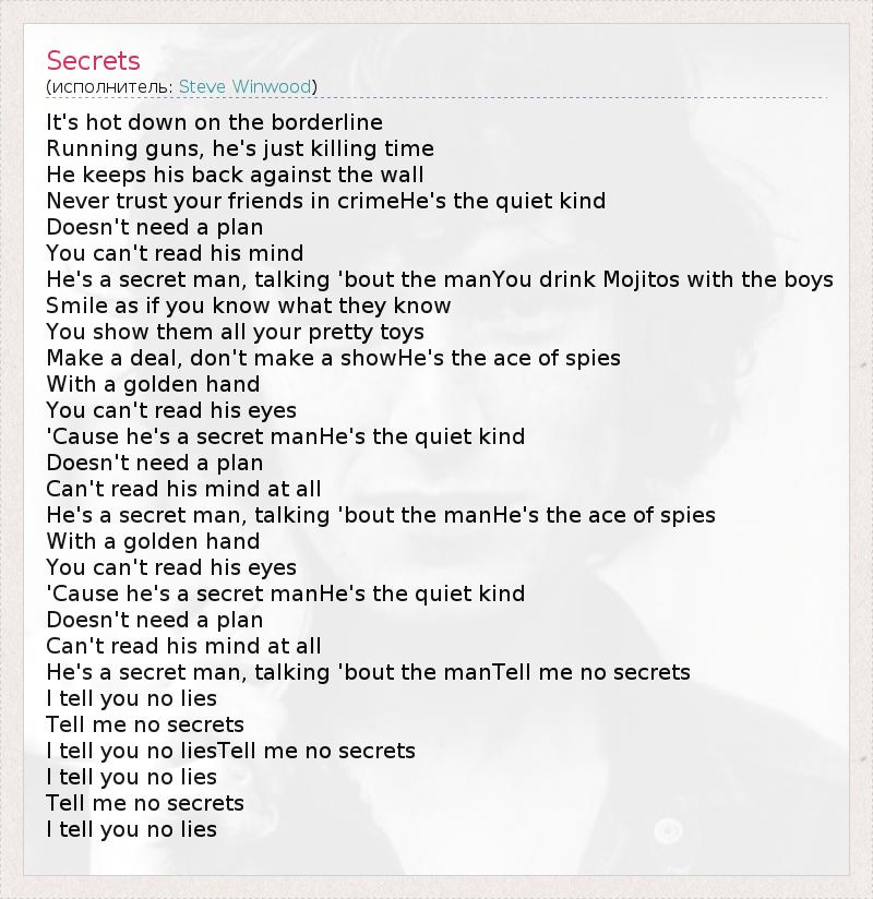 He's a secret man, talking 'bout the manTell me no secrets