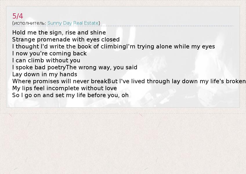 Это интересно:Sunny Day Real Estate (или SDRE) (с англ. Собственность солнечного дня) — американская альтернативная рок-группа из города Сиэттл, штат Вашингтон. Группа образовалась в 1992 году под первоначальным названием «Empty Set» и включала в себя Дэна Хэрнера (гитара, вокал), Нэйта Мэндела (бас) и Уильяма Голдсмита (барабаны).Ребята записали демо под этим названием, но тут вдруг обнаружилось,... продолжение