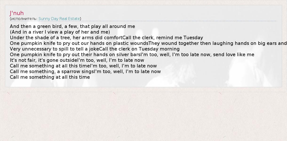 And then a green bird, a few, that play all around me (And in a river I view a play of her and me) Under the shade of a tree, her arms did comfortCall the clerk, remind me Tuesday One pumpkin knife to pry out our hands on plastic woundsThey wound together then laughing hands on big ears and Very unnecessary to spill to tell a jokeCall the clerk on Tuesday morning One pumpkin knife to pry out their hands on silver barsI'm too, well, I'm too late now, send love like me It's not fair, it's gone outsideI'm too, well, I'm to late now Call me something at all this timeI'm too, well, I'm to late now Call me something, a sparrow singsI'm too, well, I'm to late now Call me something at all this time