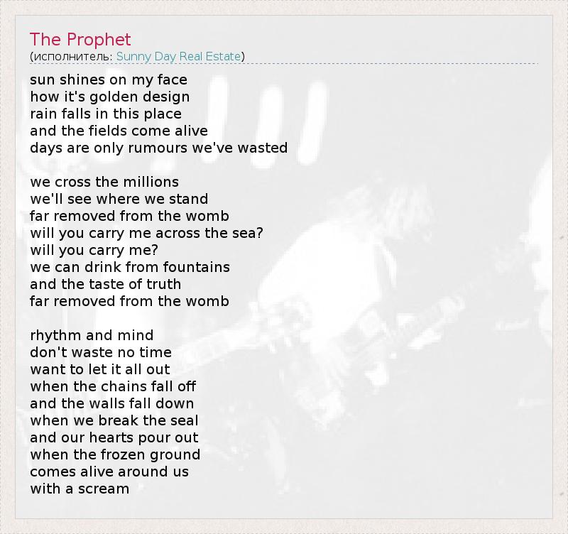 Это интересно:Sunny Day Real Estate (или SDRE) (с англ. Собственность солнечного дня) — американская альтернативная рок-группа из города Сиэттл, штат Вашингтон. Группа образовалась в 1992 году под первоначальным названием «Empty Set» и включала в себя Дэна Хэрнера (гитара, вокал), Нэйта Мэндела (бас) и Уильяма Голдсмита (барабаны).Ребята записали демо под этим названием, но тут вдруг обнаружилось,... продолжение