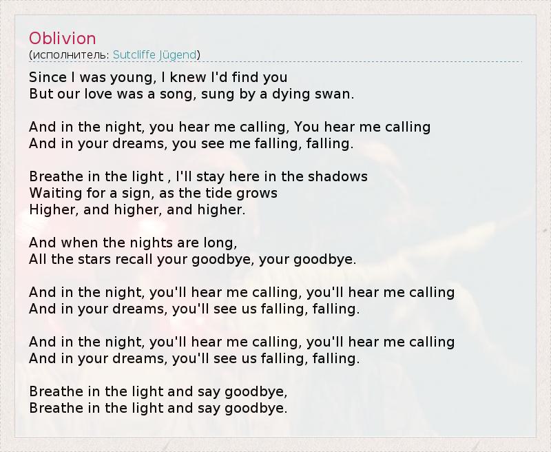 С юности я знала, что найду тебя, Но наша любовь была песней, спетой умирающим лебедем. И в ночи, ты слышишь, как я зову, слышишь, как я зову И в твоих снах, ты видишь, как я падаю, падаю. Дыша светом, я буду стоять здесь, окутанная тьмой, Ожидая знамение, пока волна растёт Выше, и выше, и выше. И когда ночи долгие, Все звёзды напоминают о твоём прощании, твоём прощании. И в ночи, ты слышишь, как я зову, слышишь, как я зову И в твоих снах, ты видишь, как мы падаем, падаем. И в ночи, ты слышишь, как я зову, слышишь, как я зову И в твоих снах, ты видишь, как я падаем, падаем. Вдохни свет и попрощайся, Наполни грудь светом и попрощайся.