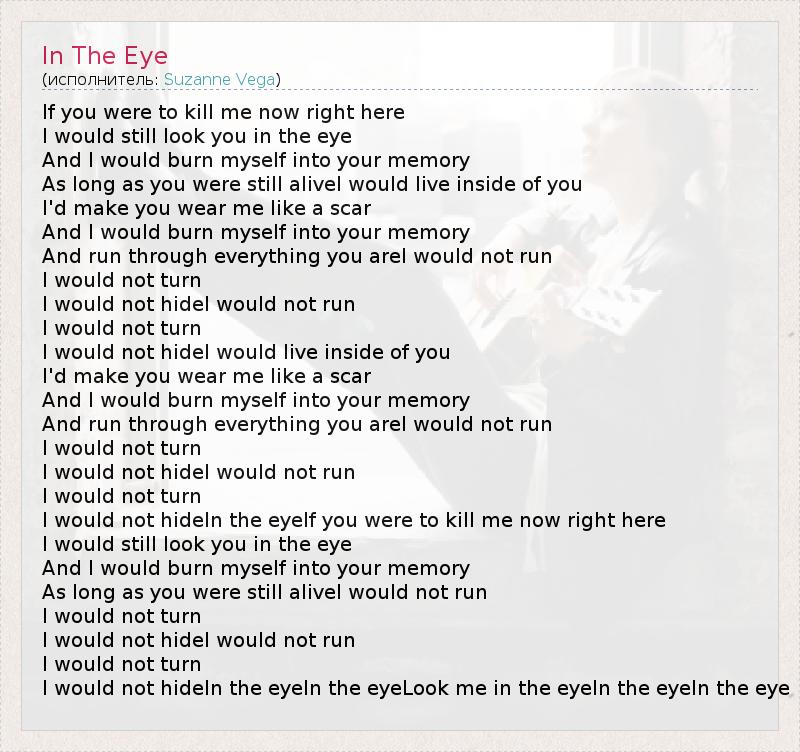 If you were to kill me now right here I would still look you in the eye And I would burn myself into your memory As long as you were still aliveI would live inside of you I'd make you wear me like a scar And I would burn myself into your memory And run through everything you areI would not run I would not turn I would not hideI would not run I would not turn I would not hideI would live inside of you I'd make you wear me like a scar And I would burn myself into your memory And run through everything you areI would not run I would not turn I would not hideI would not run I would not turn I would not hideIn the eyeIf you were to kill me now right here I would still look you in the eye And I would burn myself into your memory As long as you were still aliveI would not run I would not turn I would not hideI would not run I would not turn I would not hideIn the eyeIn the eyeLook me in the eyeIn the eyeIn the eye