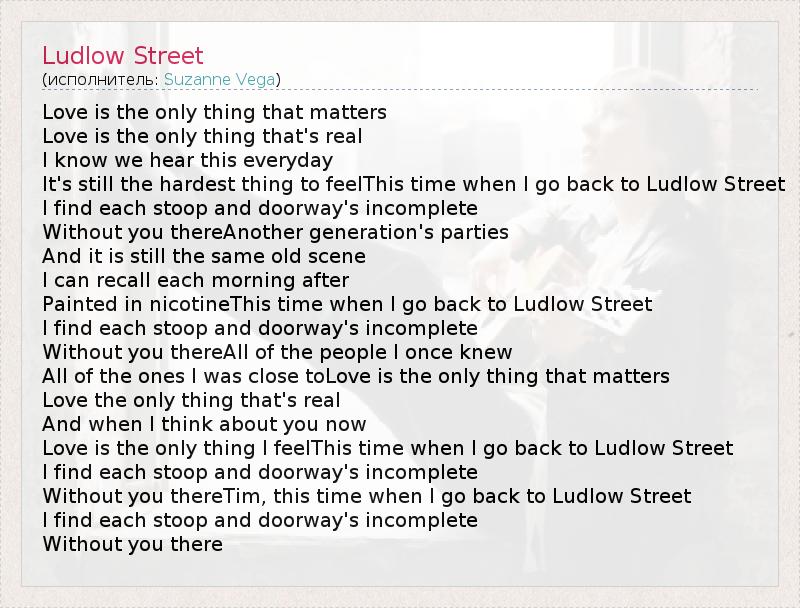 Love is the only thing that matters Love is the only thing that's real I know we hear this everyday It's still the hardest thing to feelThis time when I go back to Ludlow Street I find each stoop and doorway's incomplete Without you thereAnother generation's parties And it is still the same old scene I can recall each morning after Painted in nicotineThis time when I go back to Ludlow Street I find each stoop and doorway's incomplete Without you thereAll of the people I once knew All of the ones I was close toLove is the only thing that matters Love the only thing that's real And when I think about you now Love is the only thing I feelThis time when I go back to Ludlow Street I find each stoop and doorway's incomplete Without you thereTim, this time when I go back to Ludlow Street I find each stoop and doorway's incomplete Without you there