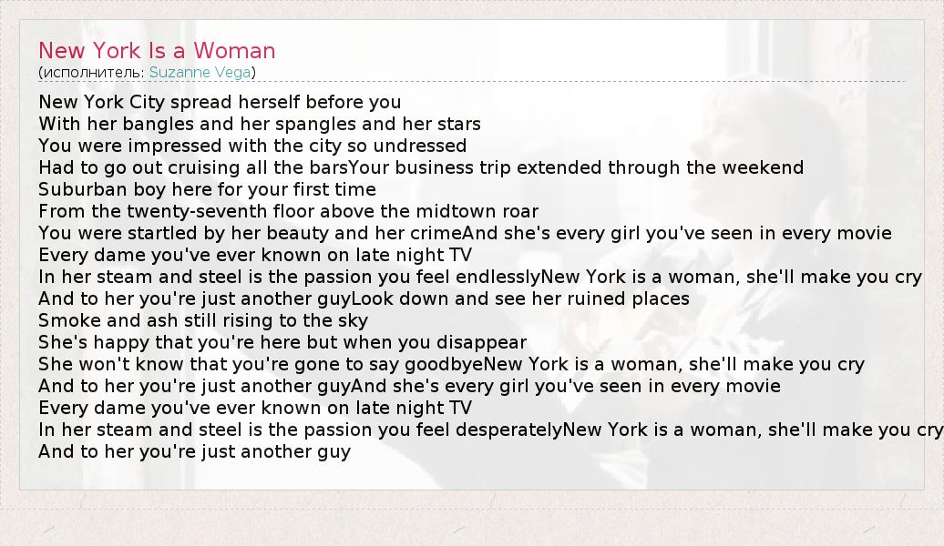 А как ты думаешь, о чем песня "New York Is a Woman" ?