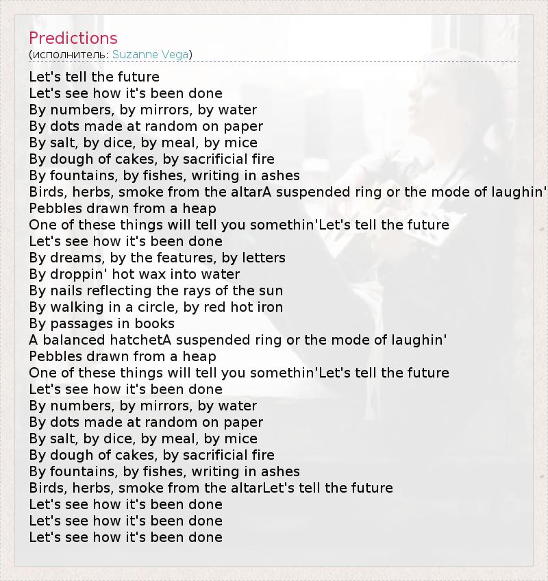 Это интересно:Сюзанна Надин Вега (англ. Suzanne Nadine Vega, род. 11 июля 1959 года в Санта-Монике, штат Калифорния) - американская инди-вокалистка, автор песен и музыки на базе фольклора, гитаристка, самая яркая тема — Tom's Diner.Однажды маленькая Сьюзанн и соседский парень Марк сидели на скамейке во дворе. Им обоим было по 4 года. Вдруг девочка нечаянно уронила свой взгляд на ухажера и нежным голоском... продолжение