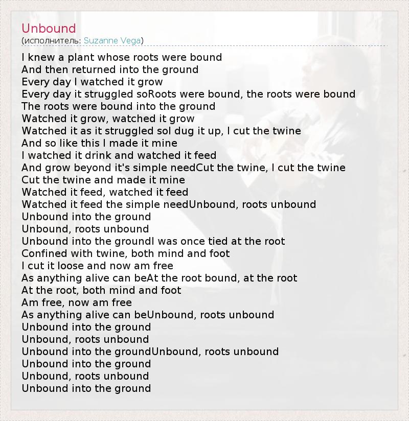 I knew a plant whose roots were bound And then returned into the ground Every day I watched it grow Every day it struggled soRoots were bound, the roots were bound The roots were bound into the ground Watched it grow, watched it grow Watched it as it struggled soI dug it up, I cut the twine And so like this I made it mine I watched it drink and watched it feed And grow beyond it's simple needCut the twine, I cut the twine Cut the twine and made it mine Watched it feed, watched it feed Watched it feed the simple needUnbound, roots unbound Unbound into the ground Unbound, roots unbound Unbound into the groundI was once tied at the root Confined with twine, both mind and foot I cut it loose and now am free As anything alive can beAt the root bound, at the root At the root, both mind and foot Am free, now am free As anything alive can beUnbound, roots unbound Unbound into the ground Unbound, roots unbound Unbound into the groundUnbound, roots unbound Unbound into the ground Unbound, roots unbound Unbound into the ground