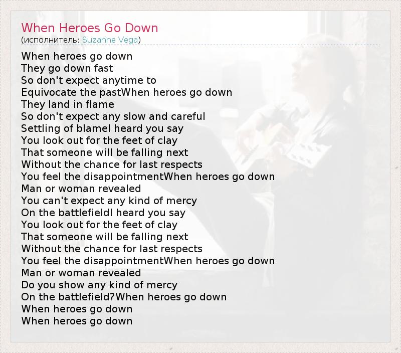 When heroes go down They go down fast So don't expect anytime to Equivocate the pastWhen heroes go down They land in flame So don't expect any slow and careful Settling of blameI heard you say You look out for the feet of clay That someone will be falling next Without the chance for last respects You feel the disappointmentWhen heroes go down Man or woman revealed You can't expect any kind of mercy On the battlefieldI heard you say You look out for the feet of clay That someone will be falling next Without the chance for last respects You feel the disappointmentWhen heroes go down Man or woman revealed Do you show any kind of mercy On the battlefield?When heroes go down When heroes go down When heroes go down