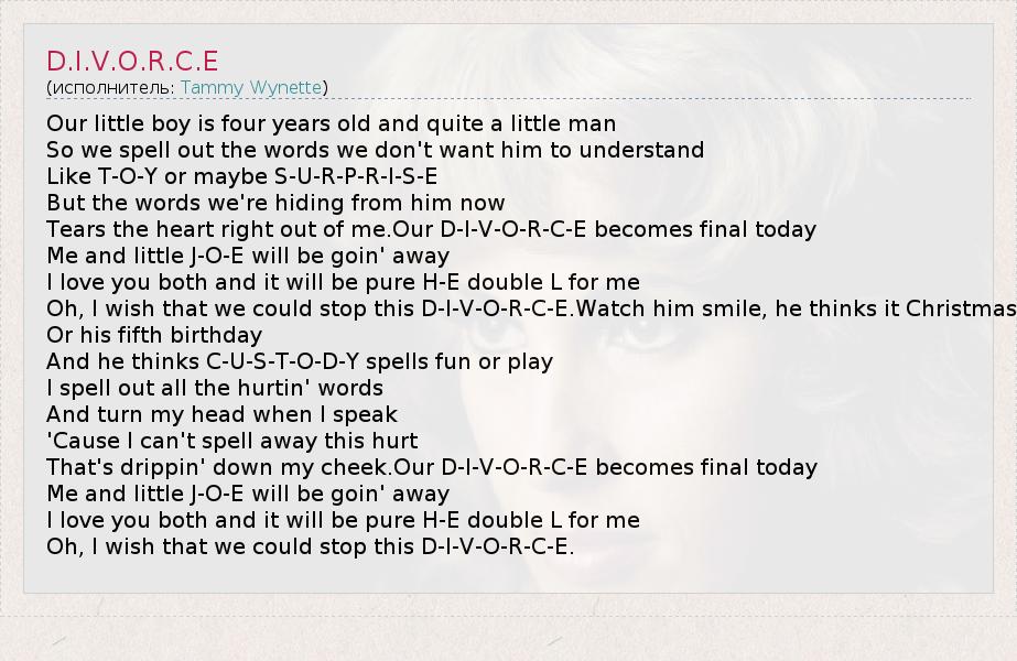 Our little boy is four years old and quite a little man So we spell out the words we don't want him to understand Like T-O-Y or maybe S-U-R-P-R-I-S-E But the words we're hiding from him now Tears the heart right out of me.Our D-I-V-O-R-C-E becomes final today Me and little J-O-E will be goin' away I love you both and it will be pure H-E double L for me Oh, I wish that we could stop this D-I-V-O-R-C-E.Watch him smile, he thinks it Christmas Or his fifth birthday And he thinks C-U-S-T-O-D-Y spells fun or play I spell out all the hurtin' words And turn my head when I speak 'Cause I can't spell away this hurt That's drippin' down my cheek.Our D-I-V-O-R-C-E becomes final today Me and little J-O-E will be goin' away I love you both and it will be pure H-E double L for me Oh, I wish that we could stop this D-I-V-O-R-C-E.