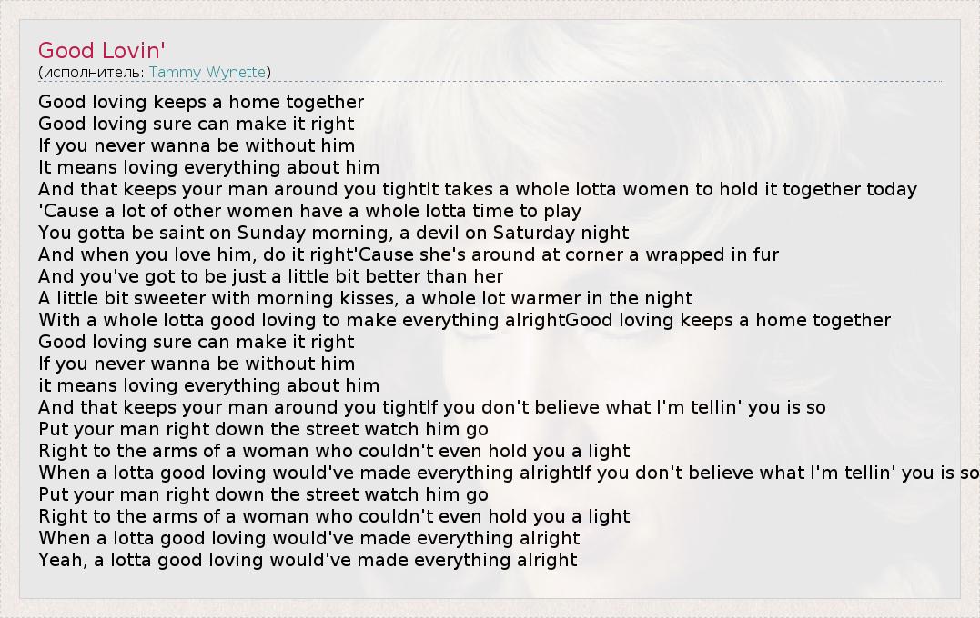 Good loving keeps a home together Good loving sure can make it right If you never wanna be without him It means loving everything about him And that keeps your man around you tightIt takes a whole lotta women to hold it together today 'Cause a lot of other women have a whole lotta time to play You gotta be saint on Sunday morning, a devil on Saturday night And when you love him, do it right'Cause she's around at corner a wrapped in fur And you've got to be just a little bit better than her A little bit sweeter with morning kisses, a whole lot warmer in the night With a whole lotta good loving to make everything alrightGood loving keeps a home together Good loving sure can make it right If you never wanna be without him it means loving everything about him And that keeps your man around you tightIf you don't believe what I'm tellin' you is so Put your man right down the street watch him go Right to the arms of a woman who couldn't even hold you a light When a lotta good loving would've made everything alrightIf you don't believe what I'm tellin' you is so Put your man right down the street watch him go Right to the arms of a woman who couldn't even hold you a light When a lotta good loving would've made everything alright Yeah, a lotta good loving would've made everything alright