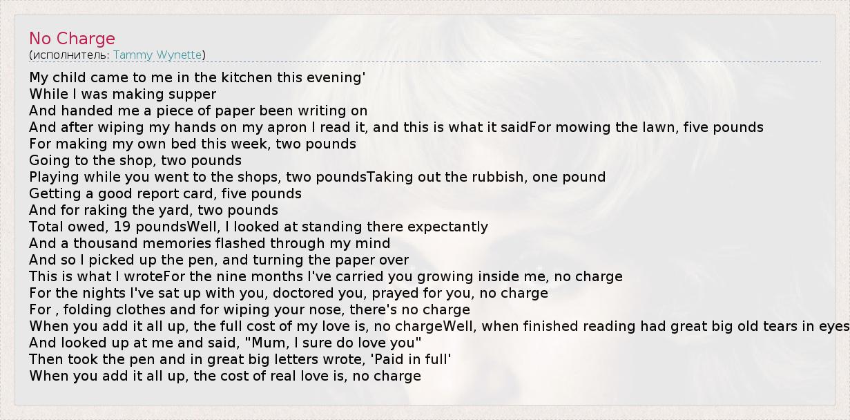 My child came to me in the kitchen this evening' While I was making supper And handed me a piece of paper been writing on And after wiping my hands on my apron I read it, and this is what it saidFor mowing the lawn, five pounds For making my own bed this week, two pounds Going to the shop, two pounds Playing while you went to the shops, two poundsTaking out the rubbish, one pound Getting a good report card, five pounds And for raking the yard, two pounds Total owed, 19 poundsWell, I looked at standing there expectantly And a thousand memories flashed through my mind And so I picked up the pen, and turning the paper over This is what I wroteFor the nine months I've carried you growing inside me, no charge For the nights I've sat up with you, doctored you, prayed for you, no charge For , folding clothes and for wiping your nose, there's no charge When you add it all up, the full cost of my love is, no chargeWell, when finished reading had great big old tears in eyes And looked up at me and said, "Mum, I sure do love you" Then took the pen and in great big letters wrote, 'Paid in full' When you add it all up, the cost of real love is, no charge