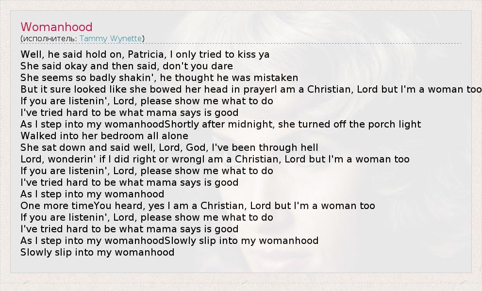 Lord, wonderin' if I did right or wrongI am a Christian, Lord but I'm a woman too