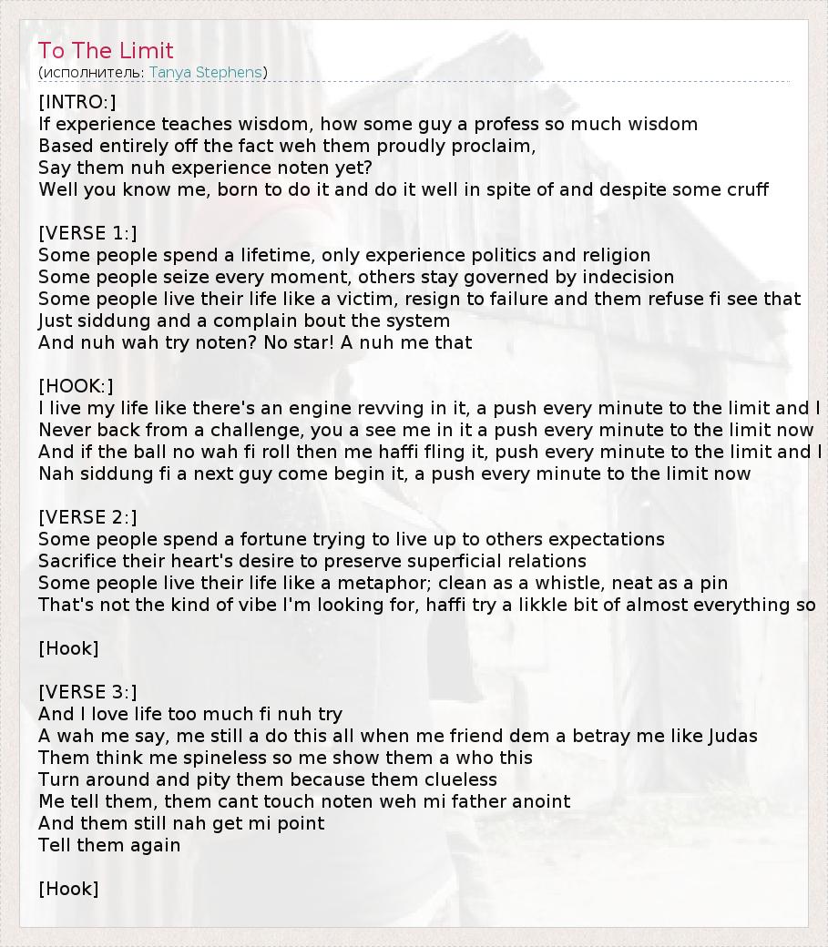[INTRO:] If experience teaches wisdom, how some guy a profess so much wisdom Based entirely off the fact weh them proudly proclaim, Say them nuh experience noten yet? Well you know me, born to do it and do it well in spite of and despite some cruff [VERSE 1:] Some people spend a lifetime, only experience politics and religion Some people seize every moment, others stay governed by indecision Some people live their life like a victim, resign to failure and them refuse fi see that Just siddung and a complain bout the system And nuh wah try noten? No star! A nuh me that [HOOK:] I live my life like there's an engine revving in it, a push every minute to the limit and I Never back from a challenge, you a see me in it a push every minute to the limit now And if the ball no wah fi roll then me haffi fling it, push every minute to the limit and I Nah siddung fi a next guy come begin it, a push every minute to the limit now [VERSE 2:] Some people spend a fortune trying to live up to others expectations Sacrifice their heart's desire to preserve superficial relations Some people live their life like a metaphor; clean as a whistle, neat as a pin That's not the kind of vibe I'm looking for, haffi try a likkle bit of almost everything so [Hook] [VERSE 3:] And I love life too much fi nuh try A wah me say, me still a do this all when me friend dem a betray me like Judas Them think me spineless so me show them a who this Turn around and pity them because them clueless Me tell them, them cant touch noten weh mi father anoint And them still nah get mi point Tell them again [Hook]