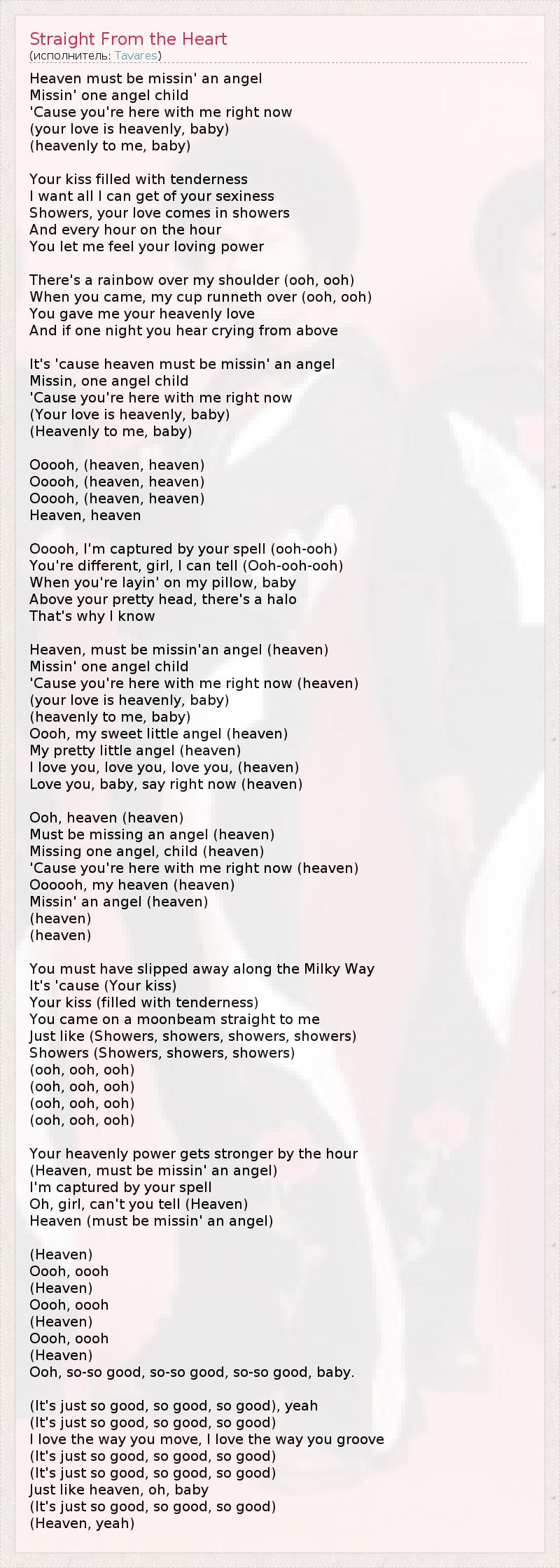 Heaven must be missin' an angel Missin' one angel child 'Cause you're here with me right now (your love is heavenly, baby) (heavenly to me, baby) Your kiss filled with tenderness I want all I can get of your sexiness Showers, your love comes in showers And every hour on the hour You let me feel your loving power There's a rainbow over my shoulder (ooh, ooh) When you came, my cup runneth over (ooh, ooh) You gave me your heavenly love And if one night you hear crying from above It's 'cause heaven must be missin' an angel Missin, one angel child 'Cause you're here with me right now (Your love is heavenly, baby) (Heavenly to me, baby) Ooooh, (heaven, heaven) Ooooh, (heaven, heaven) Ooooh, (heaven, heaven) Heaven, heaven Ooooh, I'm captured by your spell (ooh-ooh) You're different, girl, I can tell (Ooh-ooh-ooh) When you're layin' on my pillow, baby Above your pretty head, there's a halo That's why I know Heaven, must be missin'an angel (heaven) Missin' one angel child 'Cause you're here with me right now (heaven) (your love is heavenly, baby) (heavenly to me, baby) Oooh, my sweet little angel (heaven) My pretty little angel (heaven) I love you, love you, love you, (heaven) Love you, baby, say right now (heaven) Ooh, heaven (heaven) Must be missing an angel (heaven) Missing one angel, child (heaven) 'Cause you're here with me right now (heaven) Oooooh, my heaven (heaven) Missin' an angel (heaven) (heaven) (heaven) You must have slipped away along the Milky Way It's 'cause (Your kiss) Your kiss (filled with tenderness) You came on a moonbeam straight to me Just like (Showers, showers, showers, showers) Showers (Showers, showers, showers) (ooh, ooh, ooh) (ooh, ooh, ooh) (ooh, ooh, ooh) (ooh, ooh, ooh) Your heavenly power gets stronger by the hour (Heaven, must be missin' an angel) I'm captured by your spell Oh, girl, can't you tell (Heaven) Heaven (must be missin' an angel) (Heaven) Oooh, oooh (Heaven) Oooh, oooh (Heaven) Oooh, oooh (Heaven) Ooh, so-so good, so-so good, so-so good, baby. (It's just so good, so good, so good), yeah (It's just so good, so good, so good) I love the way you move, I love the way you groove (It's just so good, so good, so good) (It's just so good, so good, so good) Just like heaven, oh, baby (It's just so good, so good, so good) (Heaven, yeah)