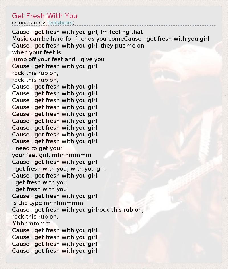 Cause I get fresh with you girl, Im feeling that Music can be hard for friends you comeCause I get fresh with you girl Cause I get fresh with you girl, they put me on when your feet is Jump off your feet and I give you Cause I get fresh with you girl rock this rub on, rock this rub on, Cause I get fresh with you girl Cause I get fresh with you girl Cause I get fresh with you girl Cause I get fresh with you girl Cause I get fresh with you girl Cause I get fresh with you girl Cause I get fresh with you girl Cause I get fresh with you girl Cause I get fresh with you girl I need to get your your feet girl, mhhhmmmm Cause I get fresh with you girl I get fresh with you, with you girl Cause I get fresh with you girl I get fresh with you I get fresh with you Cause I get fresh with you girl is the type mhhhmmmm Cause I get fresh with you girlrock this rub on, rock this rub on, Mhhhmmmm Cause I get fresh with you girl Cause I get fresh with you girl Cause I get fresh with you girl Cause I get fresh with you girl.