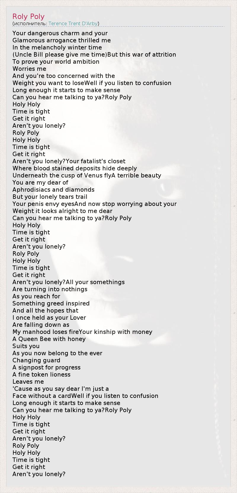 Your dangerous charm and your Glamorous arrogance thrilled me In the melancholy winter time (Uncle Bill please give me time)But this war of attrition To prove your world ambition Worries me And you're too concerned with the Weight you want to loseWell if you listen to confusion Long enough it starts to make sense Can you hear me talking to ya?Roly Poly Holy Holy Time is tight Get it right Aren't you lonely? Roly Poly Holy Holy Time is tight Get it right Aren't you lonely?Your fatalist's closet Where blood stained deposits hide deeply Underneath the cusp of Venus flyA terrible beauty You are my dear of Aphrodisiacs and diamonds But your lonely tears trail Your penis envy eyesAnd now stop worrying about your Weight it looks alright to me dear Can you hear me talking to ya?Roly Poly Holy Holy Time is tight Get it right Aren't you lonely? Roly Poly Holy Holy Time is tight Get it right Aren't you lonely?All your somethings Are turning into nothings As you reach for Something greed inspired And all the hopes that I once held as your Lover Are falling down as My manhood loses fireYour kinship with money A Queen Bee with honey Suits you As you now belong to the ever Changing guard A signpost for progress A fine token lioness Leaves me 'Cause as you say dear I'm just a Face without a cardWell if you listen to confusion Long enough it starts to make sense Can you hear me talking to ya?Roly Poly Holy Holy Time is tight Get it right Aren't you lonely? Roly Poly Holy Holy Time is tight Get it right Aren't you lonely?