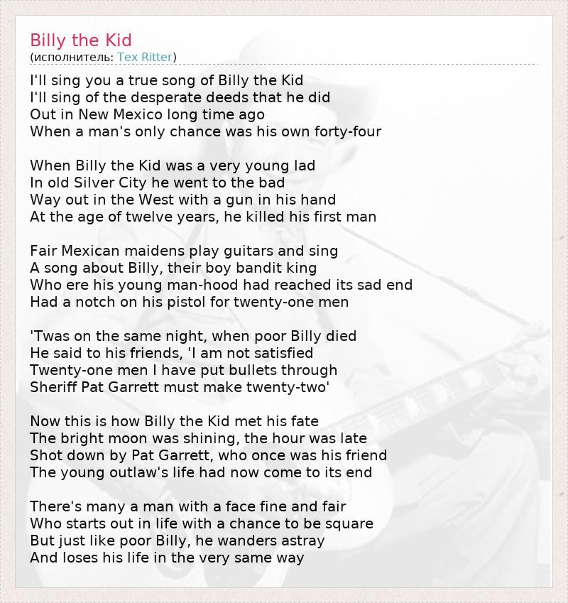 I'll sing you a true song of Billy the Kid I'll sing of the desperate deeds that he did Out in New Mexico long time ago When a man's only chance was his own forty-four When Billy the Kid was a very young lad In old Silver City he went to the bad Way out in the West with a gun in his hand At the age of twelve years, he killed his first man Fair Mexican maidens play guitars and sing A song about Billy, their boy bandit king Who ere his young man-hood had reached its sad end Had a notch on his pistol for twenty-one men 'Twas on the same night, when poor Billy died He said to his friends, 'I am not satisfied Twenty-one men I have put bullets through Sheriff Pat Garrett must make twenty-two' Now this is how Billy the Kid met his fate The bright moon was shining, the hour was late Shot down by Pat Garrett, who once was his friend The young outlaw's life had now come to its end There's many a man with a face fine and fair Who starts out in life with a chance to be square But just like poor Billy, he wanders astray And loses his life in the very same way