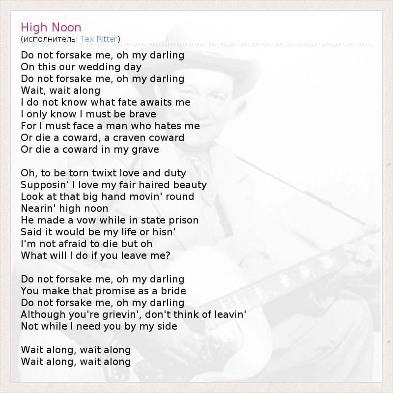 Do not forsake me, oh my darling On this our wedding day Do not forsake me, oh my darling Wait, wait along I do not know what fate awaits me I only know I must be brave For I must face a man who hates me Or die a coward, a craven coward Or die a coward in my grave Oh, to be torn twixt love and duty Supposin' I love my fair haired beauty Look at that big hand movin' round Nearin' high noon He made a vow while in state prison Said it would be my life or hisn' I'm not afraid to die but oh What will I do if you leave me? Do not forsake me, oh my darling You make that promise as a bride Do not forsake me, oh my darling Although you're grievin', don't think of leavin' Not while I need you by my side Wait along, wait along Wait along, wait along