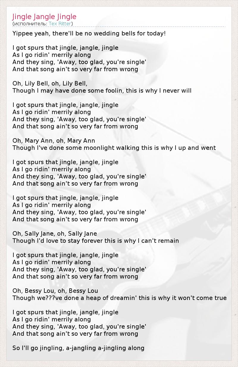 Yippee yeah, there'll be no wedding bells for today! I got spurs that jingle, jangle, jingle As I go ridin' merrily along And they sing, 'Away, too glad, you're single' And that song ain't so very far from wrong Oh, Lily Bell, oh, Lily Bell, Though I may have done some foolin, this is why I never will I got spurs that jingle, jangle, jingle As I go ridin' merrily along And they sing, 'Away, too glad, you're single' And that song ain't so very far from wrong Oh, Mary Ann, oh, Mary Ann Though I've done some moonlight walking this is why I up and went I got spurs that jingle, jangle, jingle As I go ridin' merrily along And they sing, 'Away, too glad, you're single' And that song ain't so very far from wrong I got spurs that jingle, jangle, jingle As I go ridin' merrily along And they sing, 'Away, too glad, you're single' And that song ain't so very far from wrong Oh, Sally Jane, oh, Sally Jane Though I'd love to stay forever this is why I can't remain I got spurs that jingle, jangle, jingle As I go ridin' merrily along And they sing, 'Away, too glad, you're single' And that song ain't so very far from wrong Oh, Bessy Lou, oh, Bessy Lou Though we???ve done a heap of dreamin' this is why it won't come true I got spurs that jingle, jangle, jingle As I go ridin' merrily along And they sing, 'Away, too glad, you're single' And that song ain't so very far from wrong So I'll go jingling, a-jangling a-jingling along