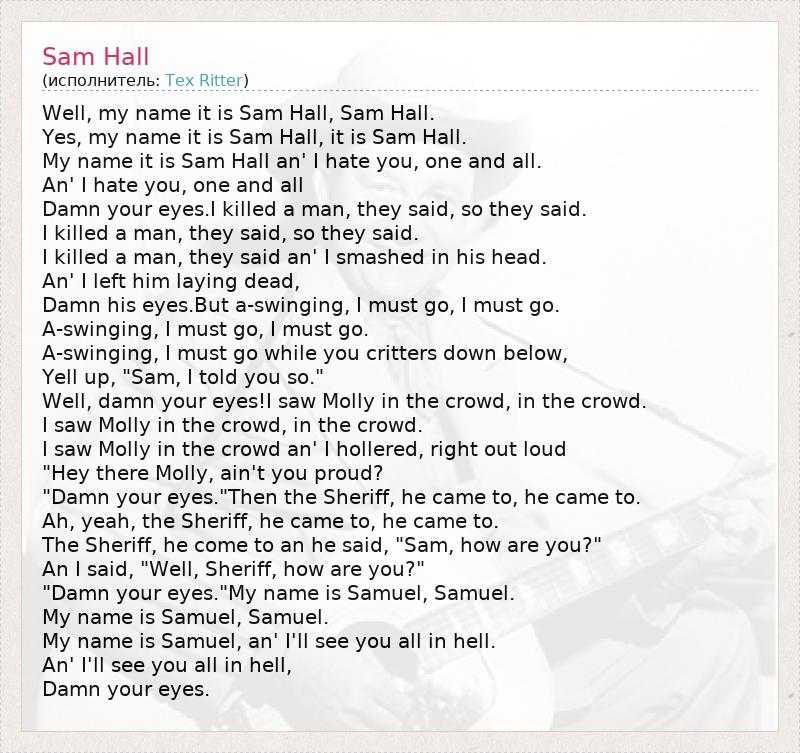 Well, my name it is Sam Hall, Sam Hall. Yes, my name it is Sam Hall, it is Sam Hall. My name it is Sam Hall an' I hate you, one and all. An' I hate you, one and all Damn your eyes.I killed a man, they said, so they said. I killed a man, they said, so they said. I killed a man, they said an' I smashed in his head. An' I left him laying dead, Damn his eyes.But a-swinging, I must go, I must go. A-swinging, I must go, I must go. A-swinging, I must go while you critters down below, Yell up, "Sam, I told you so." Well, damn your eyes!I saw Molly in the crowd, in the crowd. I saw Molly in the crowd, in the crowd. I saw Molly in the crowd an' I hollered, right out loud "Hey there Molly, ain't you proud? "Damn your eyes."Then the Sheriff, he came to, he came to. Ah, yeah, the Sheriff, he came to, he came to. The Sheriff, he come to an he said, "Sam, how are you?" An I said, "Well, Sheriff, how are you?" "Damn your eyes."My name is Samuel, Samuel. My name is Samuel, Samuel. My name is Samuel, an' I'll see you all in hell. An' I'll see you all in hell, Damn your eyes.
