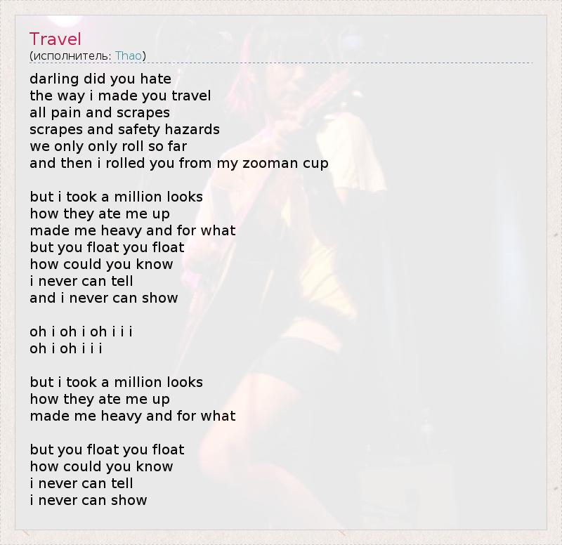 darling did you hate the way i made you travel all pain and scrapes scrapes and safety hazards we only only roll so far and then i rolled you from my zooman cup but i took a million looks how they ate me up made me heavy and for what but you float you float how could you know i never can tell and i never can show oh i oh i oh i i i oh i oh i i i but i took a million looks how they ate me up made me heavy and for what but you float you float how could you know i never can tell i never can show
