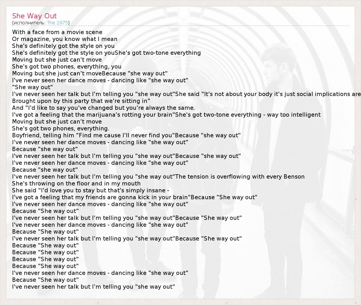 Это интересно:Обласканные вниманием британских музыкальных СМИ новички из Манчестера The 1975 – одно из самых интересных свежих лиц местной инди-сцены. “Sex”, исполненный в лучших традициях шугейза далеких 90-х, пропитан нетерпеливыми вокальными партиями и ярким синтезаторным звучанием при поддержке индастриал-ритмики. Они записали четыре ЕР перед тем как выпустить свой дебютный альбом. The 1975 был выпущен... продолжение