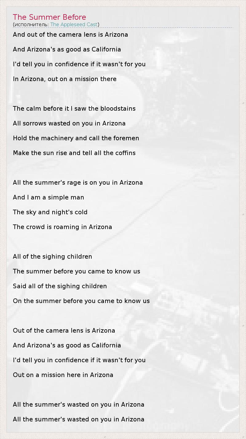 And out of the camera lens is Arizona And Arizona's as good as California I'd tell you in confidence if it wasn't for you In Arizona, out on a mission there The calm before it I saw the bloodstains All sorrows wasted on you in Arizona Hold the machinery and call the foremen Make the sun rise and tell all the coffins All the summer's rage is on you in Arizona And I am a simple man The sky and night's cold The crowd is roaming in Arizona All of the sighing children The summer before you came to know us Said all of the sighing children On the summer before you came to know us Out of the camera lens is Arizona And Arizona's as good as California I'd tell you in confidence if it wasn't for you Out on a mission here in Arizona All the summer's wasted on you in Arizona All the summer's wasted on you in Arizona