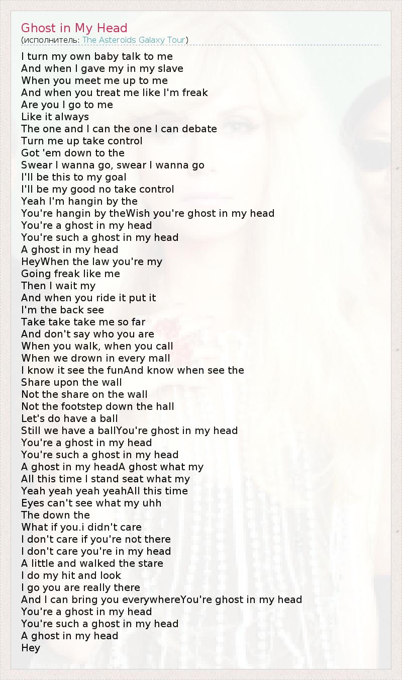 I turn my own baby talk to me And when I gave my in my slave When you meet me up to me And when you treat me like I'm freak Are you I go to me Like it always The one and I can the one I can debate Turn me up take control Got 'em down to the Swear I wanna go, swear I wanna go I'll be this to my goal I'll be my good no take control Yeah I'm hangin by the You're hangin by theWish you're ghost in my head You're a ghost in my head You're such a ghost in my head A ghost in my head HeyWhen the law you're my Going freak like me Then I wait my And when you ride it put it I'm the back see Take take take me so far And don't say who you are When you walk, when you call When we drown in every mall I know it see the funAnd know when see the Share upon the wall Not the share on the wall Not the footstep down the hall Let's do have a ball Still we have a ballYou're ghost in my head You're a ghost in my head You're such a ghost in my head A ghost in my headA ghost what my All this time I stand seat what my Yeah yeah yeah yeahAll this time Eyes can't see what my uhh The down the What if you.i didn't care I don't care if you're not there I don't care you're in my head A little and walked the stare I do my hit and look I go you are really there And I can bring you everywhereYou're ghost in my head You're a ghost in my head You're such a ghost in my head A ghost in my head Hey