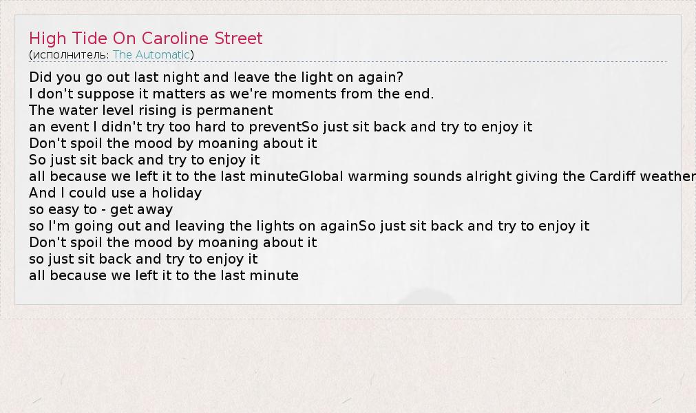 ГлавнаяИсполнителиThe AutomaticHigh Tide On Caroline Street