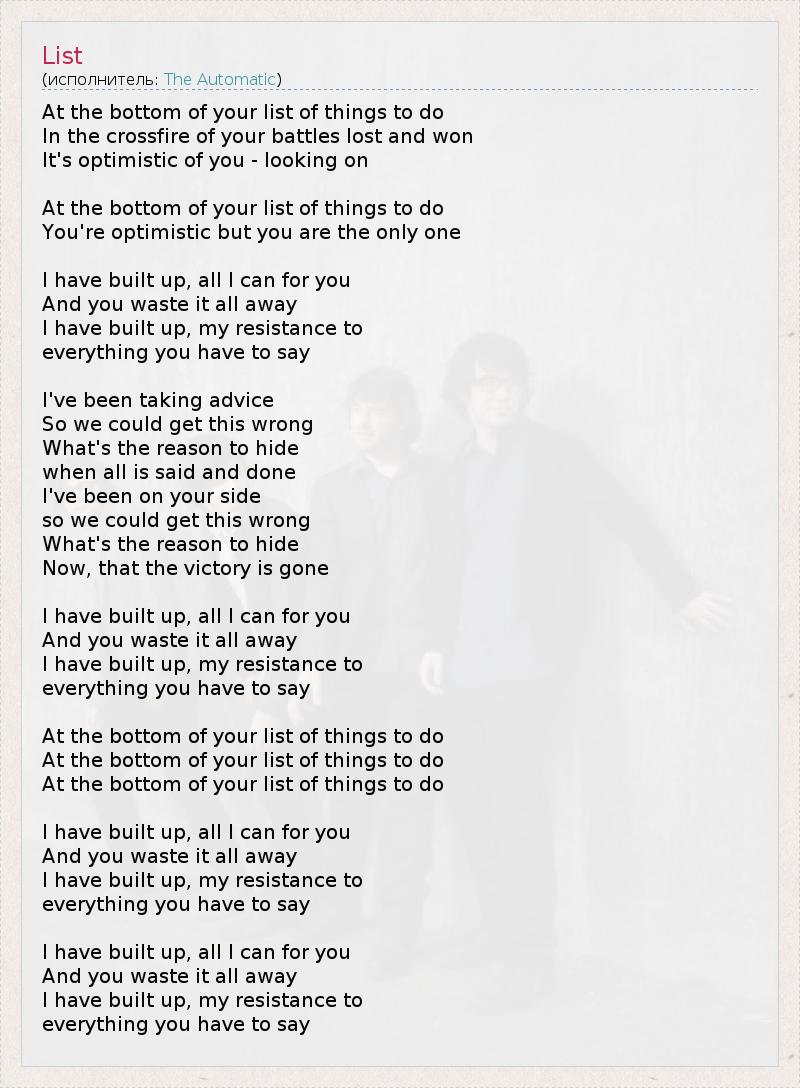 At the bottom of your list of things to do In the crossfire of your battles lost and won It's optimistic of you - looking on At the bottom of your list of things to do You're optimistic but you are the only one I have built up, all I can for you And you waste it all away I have built up, my resistance to everything you have to say I've been taking advice So we could get this wrong What's the reason to hide when all is said and done I've been on your side so we could get this wrong What's the reason to hide Now, that the victory is gone I have built up, all I can for you And you waste it all away I have built up, my resistance to everything you have to say At the bottom of your list of things to do At the bottom of your list of things to do At the bottom of your list of things to do I have built up, all I can for you And you waste it all away I have built up, my resistance to everything you have to say I have built up, all I can for you And you waste it all away I have built up, my resistance to everything you have to say