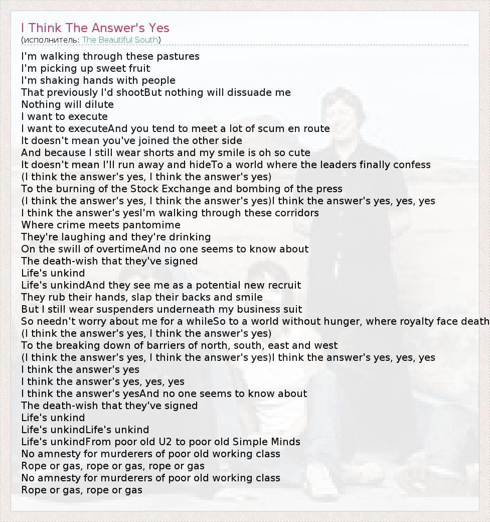 А как ты думаешь, о чем песня "I Think The Answer's Yes" ?