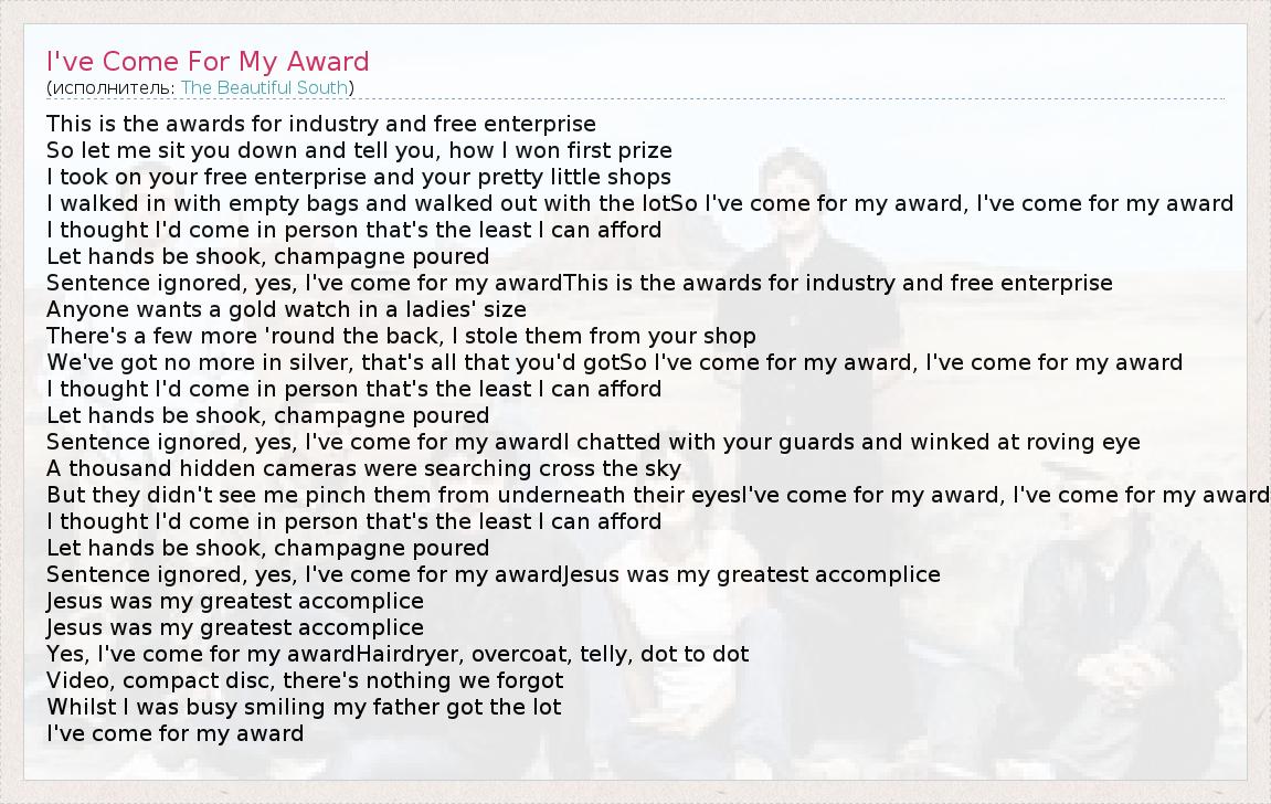 А как ты думаешь, о чем песня "I've Come For My Award" ?