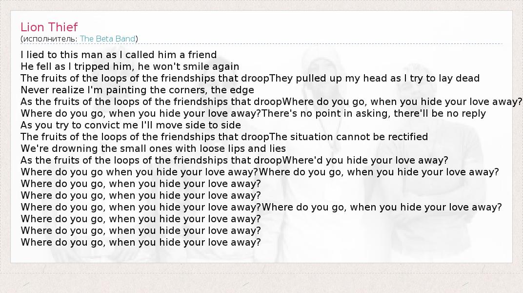 А как ты думаешь, о чем песня "Lion Thief" ?